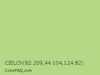 CIELCh 82.209,44.104,124.82 Color is a light green color and the nearest color is Medium Spring Bud #c9dc87. Hex code #b5d887 and RGB value is rgb(181,216,135). In RGB color space, this color is composed of 71% red, 85% green, 53% blue, In CMYK color space, this color is composed of 16% cyan, 0% magenta, 38% yellow , 15% black , In HSL color space, this color has a hue angle of 86° , 51% saturation and 69% lightness.