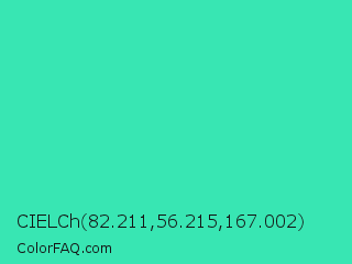 CIELCh 82.211,56.215,167.002 Color is a normal green color and the nearest color is Eucalyptus #44d7a8. Hex code #38e6b3 and RGB value is rgb(56,230,179). In RGB color space, this color is composed of 22% red, 90% green, 70% blue, In CMYK color space, this color is composed of 76% cyan, 0% magenta, 22% yellow , 10% black , In HSL color space, this color has a hue angle of 162° , 78% saturation and 56% lightness.
