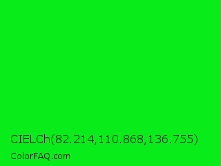 CIELCh 82.214,110.868,136.755 Color is a normal green color and the nearest color is Green #00ff00. Hex code #08ed1a and RGB value is rgb(8,237,26). In RGB color space, this color is composed of 3% red, 93% green, 10% blue, In CMYK color space, this color is composed of 97% cyan, 0% magenta, 89% yellow , 7% black , In HSL color space, this color has a hue angle of 125° , 93% saturation and 48% lightness.