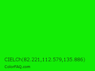 CIELCh 82.221,112.579,135.886 Color is a normal green color and the nearest color is Green #00ff00. Hex code #12ed05 and RGB value is rgb(18,237,5). In RGB color space, this color is composed of 7% red, 93% green, 2% blue, In CMYK color space, this color is composed of 92% cyan, 0% magenta, 98% yellow , 7% black , In HSL color space, this color has a hue angle of 117° , 96% saturation and 47% lightness.