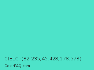 CIELCh 82.235,45.428,178.578 Color is a normal cyan color and the nearest color is Turquoise #40e0d0. Hex code #4de3c9 and RGB value is rgb(77,227,201). In RGB color space, this color is composed of 30% red, 89% green, 79% blue, In CMYK color space, this color is composed of 66% cyan, 0% magenta, 11% yellow , 11% black , In HSL color space, this color has a hue angle of 170° , 73% saturation and 60% lightness.