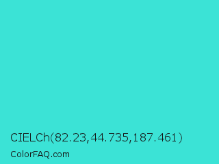 CIELCh 82.23,44.735,187.461 Color is a normal cyan color and the nearest color is Turquoise #40e0d0. Hex code #3be3d6 and RGB value is rgb(59,227,214). In RGB color space, this color is composed of 23% red, 89% green, 84% blue, In CMYK color space, this color is composed of 74% cyan, 0% magenta, 6% yellow , 11% black , In HSL color space, this color has a hue angle of 175° , 75% saturation and 56% lightness.