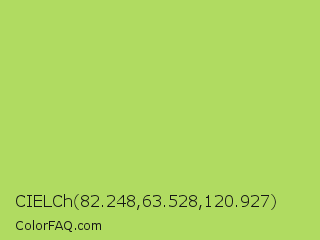 CIELCh 82.248,63.528,120.927 Color is a light green color and the nearest color is June Bud #bdda57. Hex code #b0db61 and RGB value is rgb(176,219,97). In RGB color space, this color is composed of 69% red, 86% green, 38% blue, In CMYK color space, this color is composed of 20% cyan, 0% magenta, 56% yellow , 14% black , In HSL color space, this color has a hue angle of 81° , 63% saturation and 62% lightness.