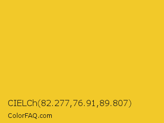 CIELCh 82.277,76.91,89.807 Color is a normal yellow color and the nearest color is Saffron #f4c430. Hex code #f2c929 and RGB value is rgb(242,201,41). In RGB color space, this color is composed of 95% red, 79% green, 16% blue, In CMYK color space, this color is composed of 0% cyan, 17% magenta, 83% yellow , 5% black , In HSL color space, this color has a hue angle of 48° , 89% saturation and 55% lightness.