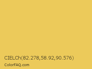 CIELCh 82.278,58.92,90.576 Color is a light yellow color and the nearest color is Cream Can #f5c85c. Hex code #ecca5a and RGB value is rgb(236,202,90). In RGB color space, this color is composed of 93% red, 79% green, 35% blue, In CMYK color space, this color is composed of 0% cyan, 14% magenta, 62% yellow , 7% black , In HSL color space, this color has a hue angle of 46° , 79% saturation and 64% lightness.