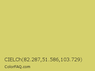 CIELCh 82.287,51.586,103.729 Color is a light yellow color and the nearest color is Chenin #dfcd6f. Hex code #d5d16c and RGB value is rgb(213,209,108). In RGB color space, this color is composed of 84% red, 82% green, 42% blue, In CMYK color space, this color is composed of 0% cyan, 2% magenta, 49% yellow , 16% black , In HSL color space, this color has a hue angle of 58° , 56% saturation and 63% lightness.