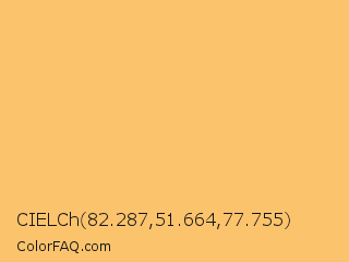 CIELCh 82.287,51.664,77.755 Color is a light orange color and the nearest color is Rajah #f7b668. Hex code #fcc36d and RGB value is rgb(252,195,109). In RGB color space, this color is composed of 99% red, 76% green, 43% blue, In CMYK color space, this color is composed of 0% cyan, 23% magenta, 57% yellow , 1% black , In HSL color space, this color has a hue angle of 36° , 96% saturation and 71% lightness.