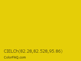 CIELCh 82.28,82.528,95.86 Color is a normal yellow color and the nearest color is Citrine #e4d00a. Hex code #e5ce07 and RGB value is rgb(229,206,7). In RGB color space, this color is composed of 90% red, 81% green, 3% blue, In CMYK color space, this color is composed of 0% cyan, 10% magenta, 97% yellow , 10% black , In HSL color space, this color has a hue angle of 54° , 94% saturation and 46% lightness.