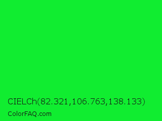 CIELCh 82.321,106.763,138.133 Color is a normal green color and the nearest color is Vivid Malachite #00cc33. Hex code #10ed30 and RGB value is rgb(16,237,48). In RGB color space, this color is composed of 6% red, 93% green, 19% blue, In CMYK color space, this color is composed of 93% cyan, 0% magenta, 80% yellow , 7% black , In HSL color space, this color has a hue angle of 129° , 87% saturation and 50% lightness.