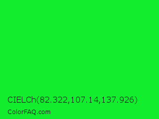 CIELCh 82.322,107.14,137.926 Color is a normal green color and the nearest color is Vivid Malachite #00cc33. Hex code #12ed2e and RGB value is rgb(18,237,46). In RGB color space, this color is composed of 7% red, 93% green, 18% blue, In CMYK color space, this color is composed of 92% cyan, 0% magenta, 81% yellow , 7% black , In HSL color space, this color has a hue angle of 128° , 86% saturation and 50% lightness.