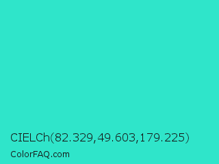 CIELCh 82.329,49.603,179.225 Color is a normal cyan color and the nearest color is Turquoise PWG #30d5c8. Hex code #2fe5ca and RGB value is rgb(47,229,202). In RGB color space, this color is composed of 18% red, 90% green, 79% blue, In CMYK color space, this color is composed of 79% cyan, 0% magenta, 12% yellow , 10% black , In HSL color space, this color has a hue angle of 171° , 78% saturation and 54% lightness.