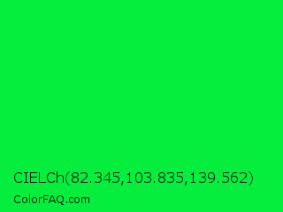 CIELCh 82.345,103.835,139.562 Color is a normal green color and the nearest color is Malachite #0bda51. Hex code #05ed3d and RGB value is rgb(5,237,61). In RGB color space, this color is composed of 2% red, 93% green, 24% blue, In CMYK color space, this color is composed of 98% cyan, 0% magenta, 74% yellow , 7% black , In HSL color space, this color has a hue angle of 134° , 96% saturation and 47% lightness.