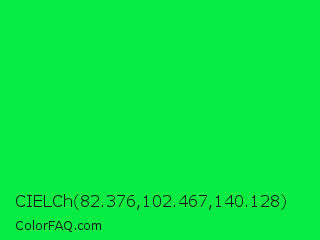 CIELCh 82.376,102.467,140.128 Color is a normal green color and the nearest color is Malachite #0bda51. Hex code #05ed42 and RGB value is rgb(5,237,66). In RGB color space, this color is composed of 2% red, 93% green, 26% blue, In CMYK color space, this color is composed of 98% cyan, 0% magenta, 72% yellow , 7% black , In HSL color space, this color has a hue angle of 136° , 96% saturation and 47% lightness.
