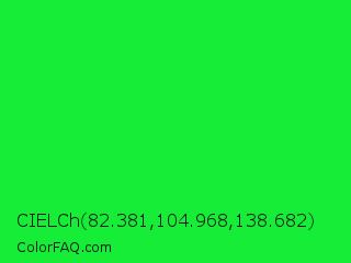 CIELCh 82.381,104.968,138.682 Color is a normal green color and the nearest color is Malachite #0bda51. Hex code #15ed37 and RGB value is rgb(21,237,55). In RGB color space, this color is composed of 8% red, 93% green, 22% blue, In CMYK color space, this color is composed of 91% cyan, 0% magenta, 77% yellow , 7% black , In HSL color space, this color has a hue angle of 129° , 86% saturation and 51% lightness.