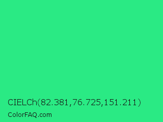CIELCh 82.381,76.725,151.211 Color is a normal green color and the nearest color is UFO Green #3cd070. Hex code #2aea84 and RGB value is rgb(42,234,132). In RGB color space, this color is composed of 16% red, 92% green, 52% blue, In CMYK color space, this color is composed of 82% cyan, 0% magenta, 44% yellow , 8% black , In HSL color space, this color has a hue angle of 148° , 82% saturation and 54% lightness.