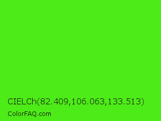 CIELCh 82.409,106.063,133.513 Color is a normal green color and the nearest color is Neon Green #39ff14. Hex code #4deb17 and RGB value is rgb(77,235,23). In RGB color space, this color is composed of 30% red, 92% green, 9% blue, In CMYK color space, this color is composed of 67% cyan, 0% magenta, 90% yellow , 8% black , In HSL color space, this color has a hue angle of 105° , 84% saturation and 51% lightness.