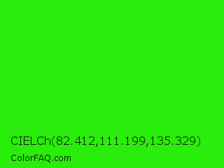 CIELCh 82.412,111.199,135.329 Color is a normal green color and the nearest color is Neon Green #39ff14. Hex code #29ed0a and RGB value is rgb(41,237,10). In RGB color space, this color is composed of 16% red, 93% green, 4% blue, In CMYK color space, this color is composed of 83% cyan, 0% magenta, 96% yellow , 7% black , In HSL color space, this color has a hue angle of 112° , 92% saturation and 48% lightness.