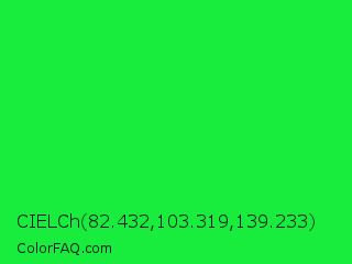 CIELCh 82.432,103.319,139.233 Color is a normal green color and the nearest color is Malachite #0bda51. Hex code #18ed3d and RGB value is rgb(24,237,61). In RGB color space, this color is composed of 9% red, 93% green, 24% blue, In CMYK color space, this color is composed of 90% cyan, 0% magenta, 74% yellow , 7% black , In HSL color space, this color has a hue angle of 130° , 86% saturation and 51% lightness.