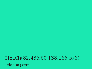 CIELCh 82.436,60.138,166.575 Color is a normal cyan color and the nearest color is Turquoise PWG #30d5c8. Hex code #1ae8b1 and RGB value is rgb(26,232,177). In RGB color space, this color is composed of 10% red, 91% green, 69% blue, In CMYK color space, this color is composed of 89% cyan, 0% magenta, 24% yellow , 9% black , In HSL color space, this color has a hue angle of 164° , 82% saturation and 51% lightness.