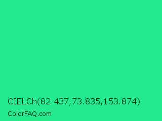 CIELCh 82.437,73.835,153.874 Color is a normal green color and the nearest color is Shamrock #33cc99. Hex code #22ea8d and RGB value is rgb(34,234,141). In RGB color space, this color is composed of 13% red, 92% green, 55% blue, In CMYK color space, this color is composed of 85% cyan, 0% magenta, 40% yellow , 8% black , In HSL color space, this color has a hue angle of 152° , 83% saturation and 53% lightness.