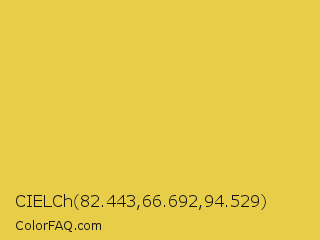 CIELCh 82.443,66.692,94.529 Color is a normal yellow color and the nearest color is Ronchi #ecc54e. Hex code #e7cd48 and RGB value is rgb(231,205,72). In RGB color space, this color is composed of 91% red, 80% green, 28% blue, In CMYK color space, this color is composed of 0% cyan, 11% magenta, 69% yellow , 9% black , In HSL color space, this color has a hue angle of 50° , 77% saturation and 59% lightness.
