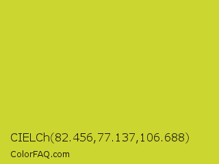 CIELCh 82.456,77.137,106.688 Color is a normal yellow color and the nearest color is Pear #d1e231. Hex code #ccd630 and RGB value is rgb(204,214,48). In RGB color space, this color is composed of 80% red, 84% green, 19% blue, In CMYK color space, this color is composed of 5% cyan, 0% magenta, 78% yellow , 16% black , In HSL color space, this color has a hue angle of 64° , 67% saturation and 51% lightness.