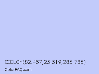 CIELCh 82.457,25.519,285.785 Color is a very light blue color and the nearest color is Periwinkle #ccccff. Hex code #c2cbfb and RGB value is rgb(194,203,251). In RGB color space, this color is composed of 76% red, 80% green, 98% blue, In CMYK color space, this color is composed of 23% cyan, 19% magenta, 0% yellow , 2% black , In HSL color space, this color has a hue angle of 231° , 88% saturation and 87% lightness.