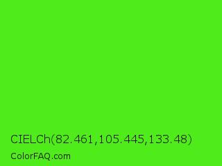 CIELCh 82.461,105.445,133.48 Color is a normal green color and the nearest color is Neon Green #39ff14. Hex code #4feb1a and RGB value is rgb(79,235,26). In RGB color space, this color is composed of 31% red, 92% green, 10% blue, In CMYK color space, this color is composed of 66% cyan, 0% magenta, 89% yellow , 8% black , In HSL color space, this color has a hue angle of 105° , 84% saturation and 51% lightness.