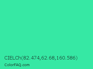 CIELCh 82.474,62.68,160.586 Color is a normal green color and the nearest color is Eucalyptus #44d7a8. Hex code #36e8a4 and RGB value is rgb(54,232,164). In RGB color space, this color is composed of 21% red, 91% green, 64% blue, In CMYK color space, this color is composed of 77% cyan, 0% magenta, 29% yellow , 9% black , In HSL color space, this color has a hue angle of 157° , 79% saturation and 56% lightness.