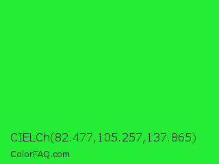 CIELCh 82.477,105.257,137.865 Color is a normal green color and the nearest color is Lime Green #32cd32. Hex code #24ed33 and RGB value is rgb(36,237,51). In RGB color space, this color is composed of 14% red, 93% green, 20% blue, In CMYK color space, this color is composed of 85% cyan, 0% magenta, 78% yellow , 7% black , In HSL color space, this color has a hue angle of 124° , 85% saturation and 54% lightness.