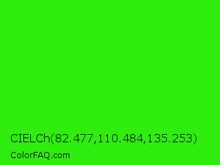 CIELCh 82.477,110.484,135.253 Color is a normal green color and the nearest color is Neon Green #39ff14. Hex code #2eed0f and RGB value is rgb(46,237,15). In RGB color space, this color is composed of 18% red, 93% green, 6% blue, In CMYK color space, this color is composed of 81% cyan, 0% magenta, 94% yellow , 7% black , In HSL color space, this color has a hue angle of 112° , 88% saturation and 49% lightness.