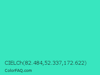 CIELCh 82.484,52.337,172.622 Color is a normal cyan color and the nearest color is Turquoise #40e0d0. Hex code #38e6bf and RGB value is rgb(56,230,191). In RGB color space, this color is composed of 22% red, 90% green, 75% blue, In CMYK color space, this color is composed of 76% cyan, 0% magenta, 17% yellow , 10% black , In HSL color space, this color has a hue angle of 167° , 78% saturation and 56% lightness.