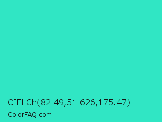 CIELCh 82.49,51.626,175.47 Color is a normal cyan color and the nearest color is Turquoise PWG #30d5c8. Hex code #30e6c4 and RGB value is rgb(48,230,196). In RGB color space, this color is composed of 19% red, 90% green, 77% blue, In CMYK color space, this color is composed of 79% cyan, 0% magenta, 15% yellow , 10% black , In HSL color space, this color has a hue angle of 169° , 78% saturation and 55% lightness.