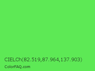 CIELCh 82.519,87.964,137.903 Color is a light green color and the nearest color is Screamin Green #66ff66. Hex code #5de955 and RGB value is rgb(93,233,85). In RGB color space, this color is composed of 36% red, 91% green, 33% blue, In CMYK color space, this color is composed of 60% cyan, 0% magenta, 64% yellow , 9% black , In HSL color space, this color has a hue angle of 117° , 77% saturation and 62% lightness.