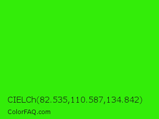 CIELCh 82.535,110.587,134.842 Color is a normal green color and the nearest color is Neon Green #39ff14. Hex code #33ed09 and RGB value is rgb(51,237,9). In RGB color space, this color is composed of 20% red, 93% green, 4% blue, In CMYK color space, this color is composed of 78% cyan, 0% magenta, 96% yellow , 7% black , In HSL color space, this color has a hue angle of 109° , 93% saturation and 48% lightness.