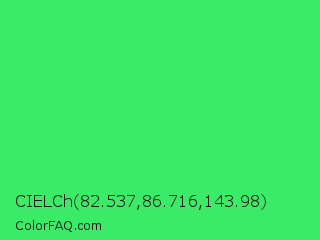 CIELCh 82.537,86.716,143.98 Color is a normal green color and the nearest color is UFO Green #3cd070. Hex code #3aeb67 and RGB value is rgb(58,235,103). In RGB color space, this color is composed of 23% red, 92% green, 40% blue, In CMYK color space, this color is composed of 75% cyan, 0% magenta, 56% yellow , 8% black , In HSL color space, this color has a hue angle of 135° , 82% saturation and 57% lightness.