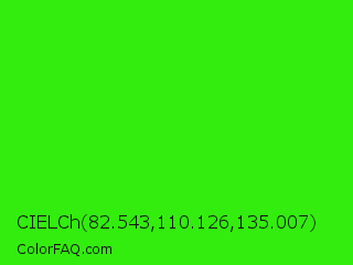 CIELCh 82.543,110.126,135.007 Color is a normal green color and the nearest color is Neon Green #39ff14. Hex code #33ed0f and RGB value is rgb(51,237,15). In RGB color space, this color is composed of 20% red, 93% green, 6% blue, In CMYK color space, this color is composed of 78% cyan, 0% magenta, 94% yellow , 7% black , In HSL color space, this color has a hue angle of 110° , 88% saturation and 49% lightness.