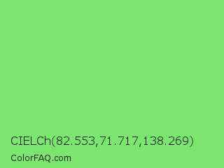CIELCh 82.553,71.717,138.269 Color is a light green color and the nearest color is Pastel Green #77dd77. Hex code #7ae56f and RGB value is rgb(122,229,111). In RGB color space, this color is composed of 48% red, 90% green, 44% blue, In CMYK color space, this color is composed of 47% cyan, 0% magenta, 52% yellow , 10% black , In HSL color space, this color has a hue angle of 114° , 69% saturation and 67% lightness.