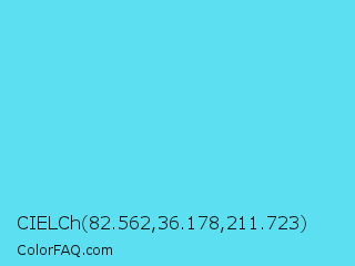 CIELCh 82.562,36.178,211.723 Color is a light cyan color and the nearest color is Turquoise Blue #6cdae7. Hex code #5cdff0 and RGB value is rgb(92,223,240). In RGB color space, this color is composed of 36% red, 87% green, 94% blue, In CMYK color space, this color is composed of 62% cyan, 7% magenta, 0% yellow , 6% black , In HSL color space, this color has a hue angle of 187° , 83% saturation and 65% lightness.