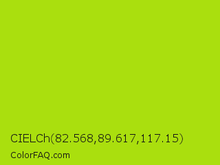 CIELCh 82.568,89.617,117.15 Color is a normal lime color and the nearest color is Inch Worm #b0e313. Hex code #aadf0e and RGB value is rgb(170,223,14). In RGB color space, this color is composed of 67% red, 87% green, 5% blue, In CMYK color space, this color is composed of 24% cyan, 0% magenta, 94% yellow , 13% black , In HSL color space, this color has a hue angle of 75° , 88% saturation and 46% lightness.