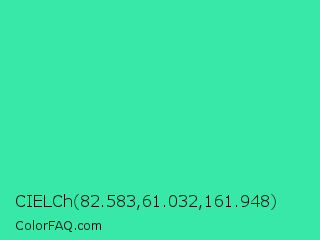 CIELCh 82.583,61.032,161.948 Color is a normal green color and the nearest color is Eucalyptus #44d7a8. Hex code #38e8a8 and RGB value is rgb(56,232,168). In RGB color space, this color is composed of 22% red, 91% green, 66% blue, In CMYK color space, this color is composed of 76% cyan, 0% magenta, 28% yellow , 9% black , In HSL color space, this color has a hue angle of 158° , 79% saturation and 56% lightness.