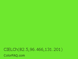 CIELCh 82.5,96.466,131.201 Color is a normal green color and the nearest color is Spring Frost #87ff2a. Hex code #6ee82e and RGB value is rgb(110,232,46). In RGB color space, this color is composed of 43% red, 91% green, 18% blue, In CMYK color space, this color is composed of 53% cyan, 0% magenta, 80% yellow , 9% black , In HSL color space, this color has a hue angle of 99° , 80% saturation and 55% lightness.