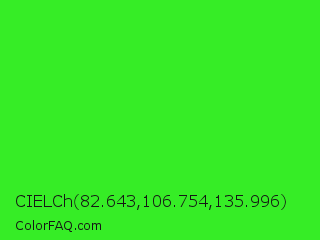 CIELCh 82.643,106.754,135.996 Color is a normal green color and the nearest color is Neon Green #39ff14. Hex code #36ed26 and RGB value is rgb(54,237,38). In RGB color space, this color is composed of 21% red, 93% green, 15% blue, In CMYK color space, this color is composed of 77% cyan, 0% magenta, 84% yellow , 7% black , In HSL color space, this color has a hue angle of 115° , 85% saturation and 54% lightness.