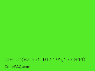 CIELCh 82.651,102.195,133.844 Color is a normal green color and the nearest color is Harlequin Green #46cb18. Hex code #55eb29 and RGB value is rgb(85,235,41). In RGB color space, this color is composed of 33% red, 92% green, 16% blue, In CMYK color space, this color is composed of 64% cyan, 0% magenta, 83% yellow , 8% black , In HSL color space, this color has a hue angle of 106° , 83% saturation and 54% lightness.