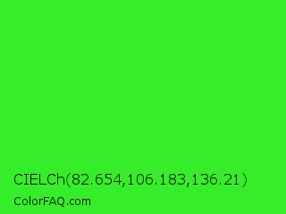 CIELCh 82.654,106.183,136.21 Color is a normal green color and the nearest color is Neon Green #39ff14. Hex code #36ed29 and RGB value is rgb(54,237,41). In RGB color space, this color is composed of 21% red, 93% green, 16% blue, In CMYK color space, this color is composed of 77% cyan, 0% magenta, 83% yellow , 7% black , In HSL color space, this color has a hue angle of 116° , 84% saturation and 55% lightness.