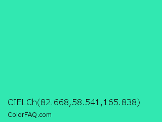 CIELCh 82.668,58.541,165.838 Color is a normal green color and the nearest color is Eucalyptus #44d7a8. Hex code #31e8b1 and RGB value is rgb(49,232,177). In RGB color space, this color is composed of 19% red, 91% green, 69% blue, In CMYK color space, this color is composed of 79% cyan, 0% magenta, 24% yellow , 9% black , In HSL color space, this color has a hue angle of 162° , 80% saturation and 55% lightness.