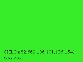CIELCh 82.669,106.101,136.154 Color is a normal green color and the nearest color is Neon Green #39ff14. Hex code #37ed29 and RGB value is rgb(55,237,41). In RGB color space, this color is composed of 22% red, 93% green, 16% blue, In CMYK color space, this color is composed of 77% cyan, 0% magenta, 83% yellow , 7% black , In HSL color space, this color has a hue angle of 116° , 84% saturation and 55% lightness.