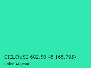 CIELCh 82.682,58.45,165.795 Color is a normal green color and the nearest color is Eucalyptus #44d7a8. Hex code #32e8b1 and RGB value is rgb(50,232,177). In RGB color space, this color is composed of 20% red, 91% green, 69% blue, In CMYK color space, this color is composed of 78% cyan, 0% magenta, 24% yellow , 9% black , In HSL color space, this color has a hue angle of 162° , 80% saturation and 55% lightness.