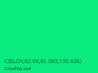 CIELCh 82.69,81.083,150.636 Color is a normal green color and the nearest color is Spring Green #00ff7f. Hex code #09ec7f and RGB value is rgb(9,236,127). In RGB color space, this color is composed of 4% red, 93% green, 50% blue, In CMYK color space, this color is composed of 96% cyan, 0% magenta, 46% yellow , 7% black , In HSL color space, this color has a hue angle of 151° , 93% saturation and 48% lightness.