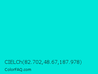 CIELCh 82.702,48.67,187.978 Color is a normal cyan color and the nearest color is Bright Turquoise #08e8de. Hex code #00e6d9 and RGB value is rgb(0,230,217). In RGB color space, this color is composed of 0% red, 90% green, 85% blue, In CMYK color space, this color is composed of 100% cyan, 0% magenta, 6% yellow , 10% black , In HSL color space, this color has a hue angle of 177° , 100% saturation and 45% lightness.